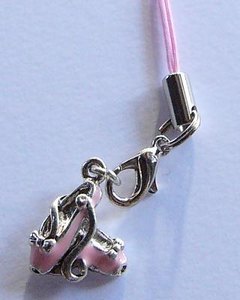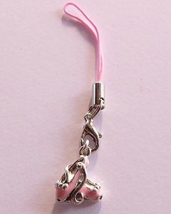 チャームの大きさは 1.5cm大。シルバー調のシューズ型でピンクのエナメル加工。携帯やポーチ、キーホルダーなどにどうぞ。