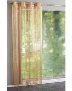 [色・デザイン] お色はトープベイジュ(くすみのあるゴールド)、光沢があります。上質ポリエステルを使用したストリングカーテン(ひもカーテン)です。ハトメカーテンスタイル。不要な部分はハサミでカットし高さを自由に調節してください。窓、ベッドルームの天蓋、間仕切りとしてお使いいただけます。