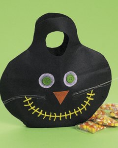 不織布の黒いバッグをキットのパーツで飾るクラフトです。バッグはすでに形になっております。付属のパーツをご家庭のボンドや両面テープで貼り付けていきます。