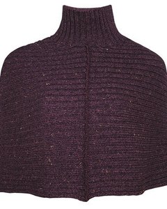 [色・デザイン] お色はダークブラウンのリブ編み。毛糸に白やブラウンが入っていて、ツイードのような色の出方になっています。頭からすっぽりかぶるタイプのケープになります。