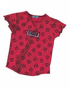 [色・デザイン] 赤地にかすれたタッチの白のポルカドッツプリント。お袖はキャップでスリーブ黒の縁取りがかわいい Tシャツです。