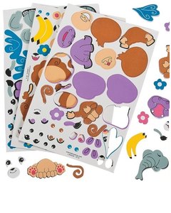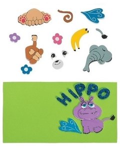 カバ、サル、ゾウの動物シールワーク、3シート。3シートで各動物 3個ずつ、計 9個作れます。顔パーツやシッポ、胴体などを貼り合わせて完成させます。ご家庭の色画用紙などを台紙にご利用ください。