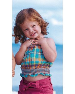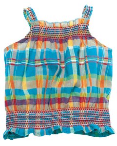 [色・デザイン] お色は鮮やかなチェック柄。身頃の上下に入ったスモッキング仕上げがアクセント。