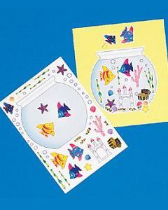 0.5 - 10cm大の大小 49枚のシール・シートです。中央の金魚鉢にワークのシールを貼り付けてお子様のオリジナル鉢を作成していきます。
