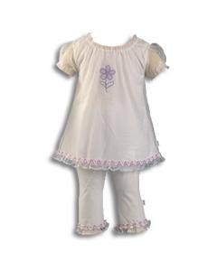 [色・デザイン] お色は白。 2枚重ねになったTシャツタイプのトップとボトムズのセットとなります。トップの身頃と袖にナイロン地の透けた素材が使われて大変涼しげなデザインです。トップとボトムズの裾にはラベンダー色と白のお花のリボン刺繍が付いていてかわいいです。胸元のお花のアップリケ刺繍がワンポイントです。