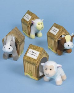紙製の小屋の中にかわいいぬいぐるみが入ったギフトボックスです。屋根の部分に To:_____ From:_____ と印字されていて、名前を記入できるようになっています。