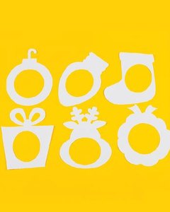 オーナメント、ライト、靴下、プレゼント、トナカイ、リースの形をした紙製フォト・フレームです。お子様がお好きなように色塗りをして完成するキットです。 6枚入り。