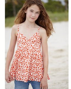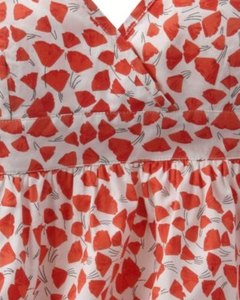 [色・デザイン] オフホワイト地にオレンジのポピープリント。ハイウエスト切り替えのキャミソールトップです。背中トップはスモッキング、ストラップは長さ調節可能。