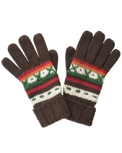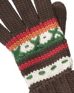 [デザイン] チョコレート色(茶)オフホワイト、赤、オレンジの模様編み。男の子用になります。