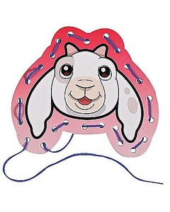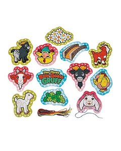 「The three billy goats Gruff」のヤギ達や背景が台紙になった「縫いさし」の キットです。モンテッソーリ教育のお仕事、「縫いさし」に似ています。 厚紙の台紙カードには 5mm大の穴が開いています。キットの毛糸を穴に通していく 作業です。