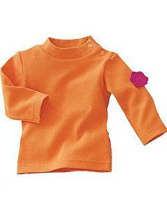 [色・デザイン] 鮮やかなオレンジ色。左の肩の下にかわいいお花が付いています。襟口左側にスナップボタン 2個付きで、着脱も簡単。 春・秋は長袖 Tシャツとして、冬はアンダーセーター (セーターの下に着用) として着ていただけます。