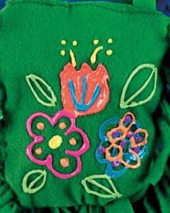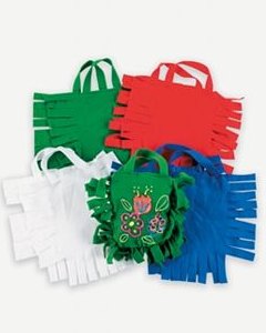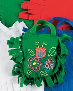 キットのバッグピースにはあらかじめ切込みが入っています。ご家庭の油性マーカーやアクリルペイント、ボタンやビーズなどのクラフト素材でバッグの表面を飾りつけ、バッグのフリンジを結んで立体に組み立てて仕上げます。赤、青、白、緑の4色。
