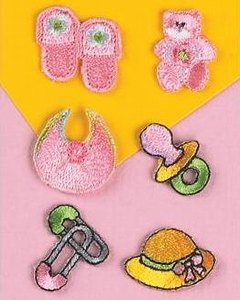 1.5 - 2.5cm大の刺繍ピースのセットです。セット内容は、スリッパ、テディーベア、安全ピン、スタイ、おしゃぶり、帽子の 6点になります。ファーストアルバムにどうぞ!!