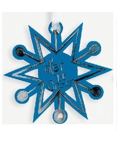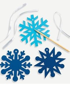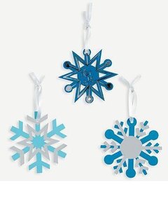 スクラッチアートで作る雪の結晶型オーナメント 3枚です。表面をキットのスティックで擦ると水色や青の膜の下から銀色の背景が線に沿って見えてきます。 3枚につき 1本のスティックが付いています。
