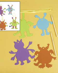 スクラッチアートで作るモンスターの飾り 4枚セットです。シールの表面をキットのスティックで擦ると、表面の膜の下から虹色の背景が線に沿って見えてきます。 4枚につき 2本のスティックが付いています。