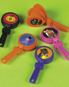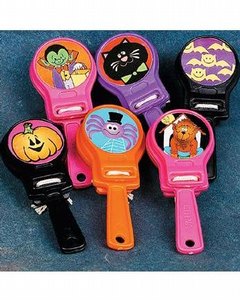 7.5cm大のプラスチック製のクラッカーです。持ち手を握って、手の甲や手のひらに当てるとカタカタと音がします。ハロウィンパーティーの景品として、小さなお子様のおもちゃにどうぞ。