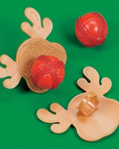 トナカイの顔の形をしたプラスチック製のリング。トナカイの鼻の形をした 2.5cm大のボール付き。顔面と赤のボールにマジックテープ付いていて、ボールを空中に投げてトナカイの顔で受け止めて遊びます。卓上サッカーもいいかも知れません。精巧なおもちゃというよりは、季節感を取り入れた雑貨感覚のおもちゃになります。