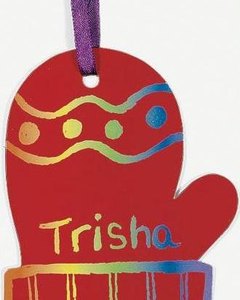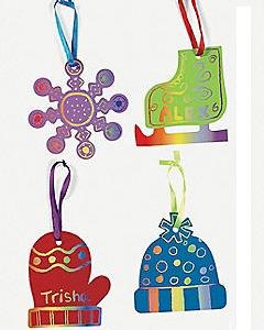 スクラッチアートで作る飾り 4枚です。シールの表面をキットのスティックで擦ると、表面の膜の下から虹色の背景が線に沿って見えてきます。 4枚につき 2本のスティックが付いています。