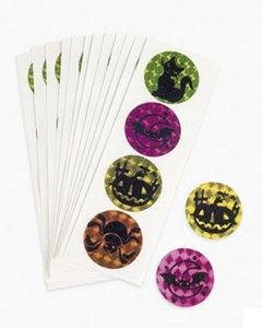 キラキラした表面に黒のビロード調の絵柄が付いたシール 4枚です。シールの大きさは 3.5cm大。