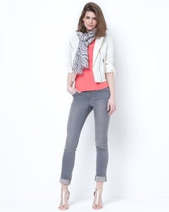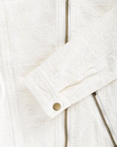 [色・デザイン] お色は白。アシンメタリーなフロントが大胆な、バイカー風ジャケットです。フロントファスナー付きポケット2個、袖口スナップボタン。