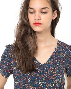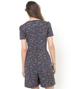 リバティー地のワンピース型オールインワンつなぎです。半袖、Vネック、背中ファスナー+ボタン開閉。一見ワンピースに見える、フェミニンなつなぎです。
