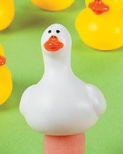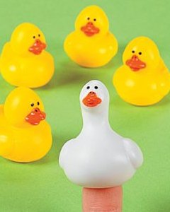3cm大のアヒルの子 5体と 4cm大のガチョウ 1体のセット。ビニール製。