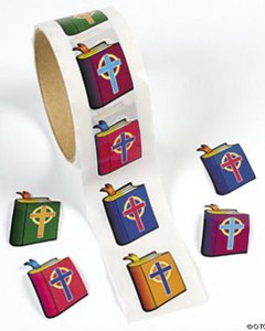 直径 3.5cm 大の聖書のイラストシール。 5枚のシールは全て絵柄が異なります。