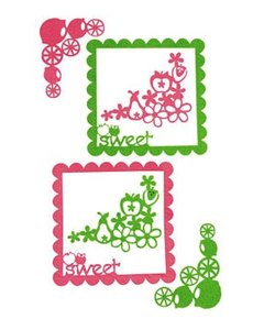 フルーツサラダをテーマにしたフエルト素材のフレーム 2枚とフォトコーナー 4個のセット。ピンクと黄緑の 2色入り。
