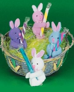 CANDY HUGGER と呼ばれるキャンディー用の飾りです。かわいいバニーがスティック状のキャンディーを抱えられるよう手足の先にマジックテープが付いています。キャンディーはもちろんバスケットのハンドルやドアノブにかけてもかわいいです。お色はお任せください。