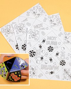 折り紙の「ぱくぱく(ぱっくんちょ)」で占いを楽しむシートです。お子様が自由に色塗りを楽しんだ後は折り紙をして画像左下の占いゲームを仕上げます。