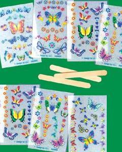 1シートに 5mm - 3cm 大のモチーフが25個前後入った転写シートです。キットのへらを使ってTシャツやバッグ、帽子など布の表面に擦るだけで鮮やかな蝶のモチーフが写ります。絵柄はお任せください。