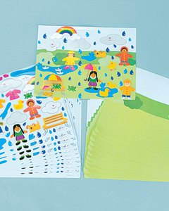 横 28cm x 縦 21.5cm大の背景用の台紙に45枚のシールシートが付いています。傘、雨、長靴、水たまり、虹、カエルなどのシールを自由に貼り付けて、オリジナルの雨の日を描いてください。ちょっとたいくつな雨の日のアクティビティーにどうぞ。台紙とシールがセットになります。