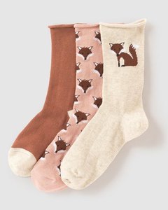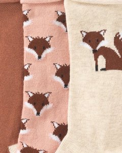 [色・デザイン] かわいいキツネ柄が 2種類、明るい茶色とオフホワイトの無地タイプが 1足入ったセット。
