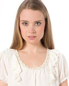 [色・デザイン] お色はオフホワイトにパステル花柄。 ネックラインのフリル、レース パール調のビーズ使いがかわいいワンピです。