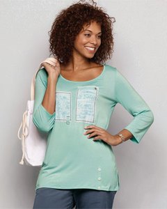 [色・デザイン] ペパーミントグリーン地にコットンプリントがアクセントの七分袖 Tシャツ。