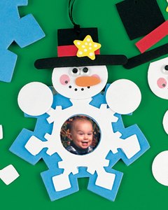 体が雪の結晶柄のお洒落なスノーマンのフォトフレーム型オーナメントを作るキットです。