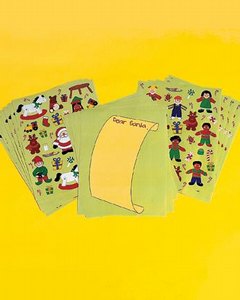 横 21.5 x 縦 28cm大の背景用台紙をキットのシールで飾りつけ、欲しいプレゼントのリストやメッセージを書き込むデザインです。シールシートは 2種類ございます。