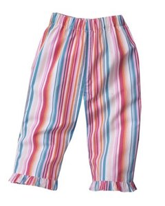[色・デザイン] 濃淡のある 2色のピンクにブルー、ベイジュ、オレンジのストライプ。ウエスト総ゴム。裾のフリルがお洒落です。