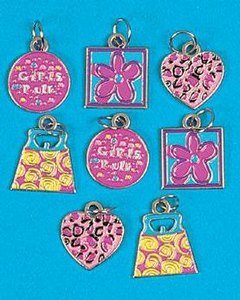 1.5cm大のハート、花、ハンドバッグ、 GIRLS' RULEの 4つのチャームのセットです。ご家庭のチェーンや細めのサテンリボンに付けてネックレスにしたり、携帯のアクセサリーなどにどうぞ。