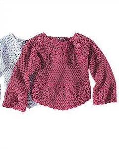 [色・デザイン] お色はラズベリー。袖口に広がったクロシェ編みのコットンニットです。ご家庭のタンクトップと組み合わせてどうぞ。