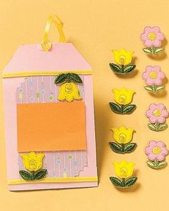 フエルトに刺繍された黄色のチューリップとピンクの 2種類。シールになっているので簡単に貼り付けられます。スクラップブッキング、カード作りのアクセントにどうぞ。