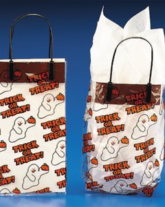 透明に TRICK OR TREAT! のメッセージとかわいいゴーストの柄のビニール製バッグです。ハロウィンのお菓子を詰めてみてはいかがでしょう?