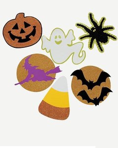 ハロウィンにちなんだキャラクターのカットアウト 6枚入り。ラメが付いています。イベントなどで壁やドアに貼ってください。