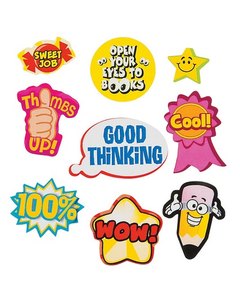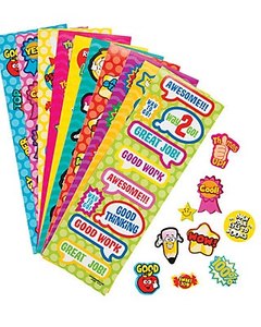 イラストや文字で激励するご褒美シール、10シート。1シートに 2 - 2.5cm大のシールが 10枚付いています。絵柄はそれぞれ異なります。
