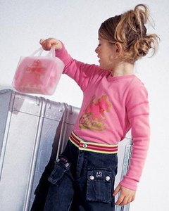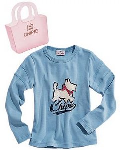[色・デザイン] 大変柔らかなコットンの長袖 Tシャツです。フロントにトレードマークのスコティッシュ・テリアのプリントと Chipie の文字が入っています。バッグは半透明のサーモンピンクで、こちらにもロゴが入っています。 ※ 3枚目の画像はお色違いです。イメージの参考にどうぞ。
