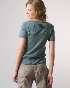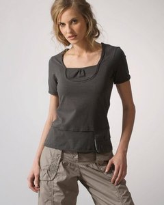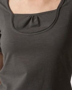 [色・デザイン] お色はカーキ。スクウエアネック。フロント裾のポケット、バックの横タックと切り替えが目を引きます。袖口と裾の切りっぱなしでくるんとなっていてお洒落です。