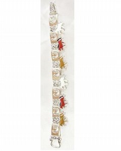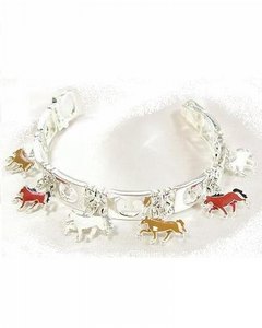 [デザイン] ブレスレット本体のシルバー調の 7枚の板は馬蹄型の型抜きになっています。その間にエナメル加工された馬のチャームが計 6個付いています。ブレスレットの留め具は中折れ式なので簡単に装着できます。手首を飾るだけでなく、バッグのハンドルにアクセサリー代りに付けてもかわいいです。