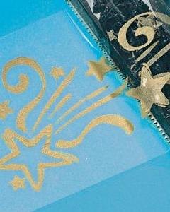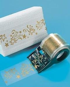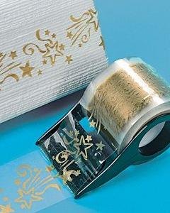 透明テープで、ゴールドの星模様が入っています。プラスチック製のテープカッターが付き。台湾製。