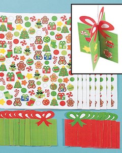 2枚のカードを組み合わせた立体的なプレゼントのオーナメントをキットのシールで飾り付けるクラフトです。赤と黄緑の 2個のオーナメントが完成します。