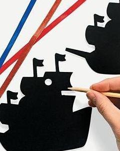 シートの表面をキットのスティックで擦りながら絵を描きます。シートの表面の黒い膜が削られて下から虹色の背景が線に沿って見えてきます。絵や文字を自由に描いて世界に 1つしかないオーナメントを作ってみましょう。